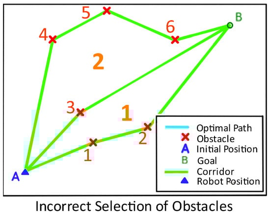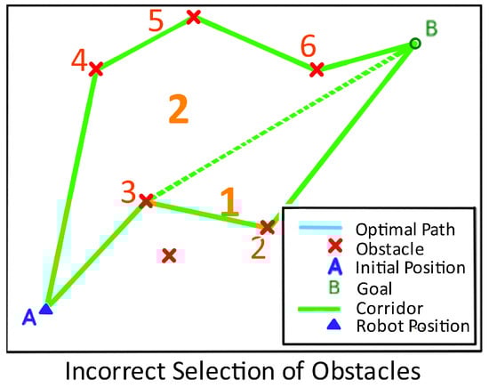 The materials and methods described in the previous subsection above are deployed in the proposed algorithm: the authors developed a local planner based on Bézier curves. The proposed algorithm consists of using the fixed and mobile obstacles as waypoints inside the classical Bézier curves and enhancing the algorithm using geometrical artifices. For selecting and ordering the waypoints, the authors used the D* Lite algorithm to compute the optimal path. The obstacles that are closest to the optimal path were used as waypoints, but only after their positions are ordered by the time at which the guided robots will theoretically surpass each waypoint’s current positions.
