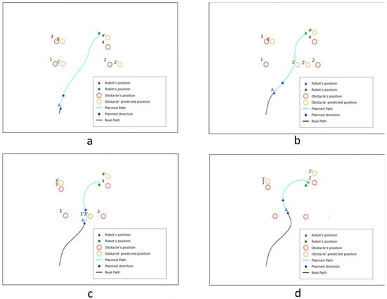 Figure 8a through Figure 8d present how the enhancements action while the robot traverses the dynamic environment. Figure 8a present how the algorithm predicts the position of the obstacles, orders them as notes in the previous section, and creates the smooth path. Figure 8b presents that when the robot is closer to obstacles, the two closest predictions (orange circles denoted 1’ and 2’) are gradually positioned such as the robot passes uniformly (at equal distances) between obstacle 1 and obstacle 2. Figure 8c also showcases the movements of the two closest obstacles. Figure 8d showcases how the closest obstacles are not taken into account after the robot successfully surpasses the obstacles’ direction of deplasation.