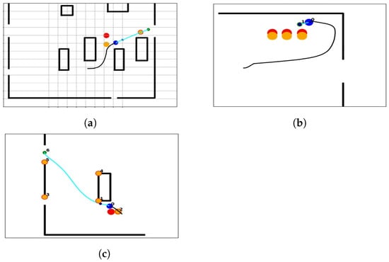 The strategies used for cases (a) through (c) also make use of adapting the waypoints but use more conditional cases. Cases (b) and (c) illustrate the conditions. For case (c), the space between the red mobile obstacle and the black shelf was detected as large enough to pass between them, whereas for case (b), the initial trajectory was colliding with the obstacles, so the guided robots stopped for two seconds, after which they look for a detour by using the right-side wall as waypoints.