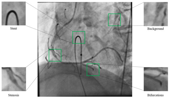 Moreover, the XCA screening test obtains high-resolution images of the main coronary arteries and their branches [6]. However, automatic stenosis detection is not easy due to the specific characteristics of XCA images, mainly background noise, the presence of a coronary stent, non-coronary vascular structures (i.e., ribs), and multiple superposed branching points [7,8,9], as shown in Figure 1.