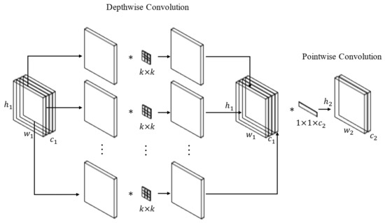 where ∗ represents the convolution operation and k—the filter size, Depthwise Separable Convolutions (DSC) factorize a standard convolution by two independent convolutions: (1) depthwise convolution and (2) point-by-point convolution (1 × 1 convolution), as shown in Figure 3. The depthwise convolution decoupled the input feature map from its channels, applying a single filter to each input channel, as follows: