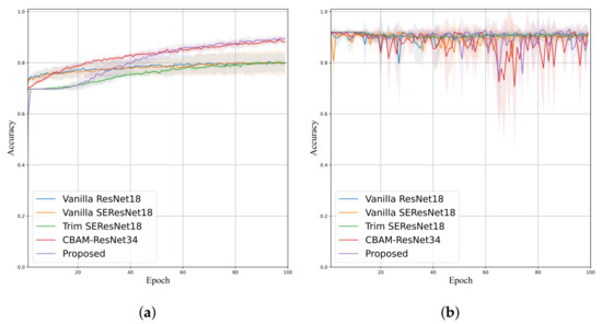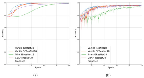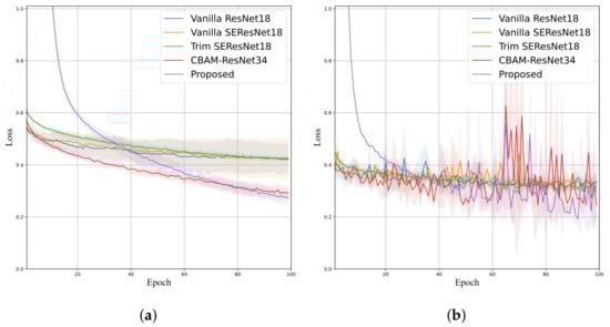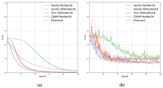 The performance employing the P-ADSD dataset is shown in Table 5. In this case, the proposed model achieved the best mean Accuracy, Sensitivity, Precision, and F-score with , , , and , respectively; and the second-best Specificity with (only below). Comparing the models within an attention mechanism, the proposed model had a gain in four evaluation metrics; CBAM-ResNet34 obtained the best Specificity, while Trim SE-ResNet performed poorly in Sensitivity () and F-score (). Their corresponding training and validation curves are shown in Figure 8 and Figure 9, confirming that the proposed model attained the lowest validation loss and higher validation accuracy than Trim-ResNet18 and Vanilla SE-ResNet18. The training curves exhibited a smoother behavior than the validation curves, where the LRSE-Net displayed lower accuracy and greater loss. Nevertheless, this leads to a better generalization performance.
