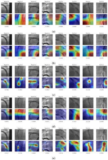 The GradCAM responses for the test subset of the A-DSSS dataset. Four negative and four positive stenosis cases are shown. (a) Vanilla ResNet18, (b) Vanilla SE-ResNet18, (c) Trim SE-ResNet18, (d) CBAM-ResNet34, and (e) Proposed LRSE-Net. Red tones stand for high-attention regions, and purple for low-attention ones. Bellow each image, the probability of stenosis is set. For values higher than , the models classify as stenosis cases.