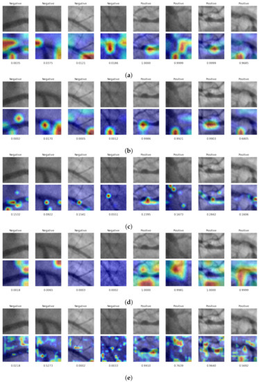 As can be seen in Figure 11 for the P-ADSD dataset, the GradCAM featured more isolated high-attention regions in all the cases. These regions are located over blood vessel pixels for the Vanilla ResNet18 and the ResNet’s including SE block. In addition, the CBAM-ResNet34 (d) showed high attention to the positive stenosis cases in the background zones of the image.
