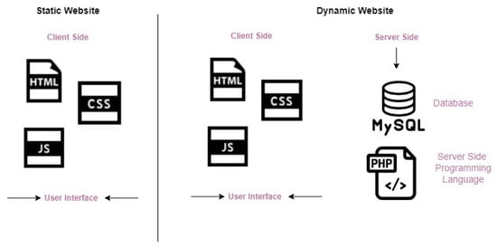 Web security involves protecting the website or web application from unauthorized users, especially those who want to sabotage devices and networks via vulnerabilities, to damage, steal, and disrupt data. Web security is important because government, economic, commercial, and educational websites are uploaded on the web. Defacing websites is a threat to web security and a nuisance. Attackers may do this for fun or political reasons. Web security confidentiality, integrity, and availability can be considered protection measures for static and dynamic web pages. However, dynamic sites are less secure and more exposed to the internet than static sites. Because of the presence of interactive communication between the site and the database, a database can be exploited. Figure 3 presents an overview of what a static and a dynamic website look like. A static web page is a prepared HTML file fully formed and located on the server storage waiting to be requested by a client and displayed. In this case, the client is a web browser. The browser generates a URL to address a particular HTML file. The URL is sent to the server to request the page from the server’s database. The server then locates the HTML page on the server’s local disk. The page will be packaged in the HTTP protocol to be transmitted back over the internet. The HTTP package that contains a copy of the HTML page will be sent to the client, which is the browser. The browser will read the tags in the HTML file and Figure out what to present. Moreover, the JavaScript programming language is also present to show some operations attached to the HTML file content. The idea behind static web pages is that there are no interactive sessions between the client and the server. The database cannot be reached by client requests because there are no texts or queries to be entered into the server database, which makes it less vulnerable to attacks. In dynamic web pages, the data are processed on two sides: the client side and the server side. However, the client side is the front-end user interface developed by HTML (HyperText Markup Language), CSS (Cascading Style Sheets), and JavaScript, while the server side is the back end, which is processed by PHP (PHP Hypertext Preprocessor), SQL (Sequential Query Language), Python, JAVA, Ruby, and Node.js. The dynamic web page generates the content through server-side language, fetching the data from a database (such as MySQL) on the server and sending it back to the client. Dynamic web pages have dynamic content generation where the client-side content is based on the user’s input; this involves requesting a service or query through the user interface. The web browser obtains the web page from the server and then addresses the code within the page to render information to the user. The importance of protecting databases and controlling their access is clear. Any change in the database of a web page or website will be reflected on the user’s interface. The difference between static and dynamic is that dynamic involves communication from the user’s side. One does not know if the user is an attacker or a normal user. The attacker will use many types of attacks on the database. The most famous examples are SQL injection attacks, denial of service attacks, and cross-site scripting. By means of these attacks, web pages can be defaced or altered. Protecting networks and databases with detection systems and firewalls is significant [2,3,4].