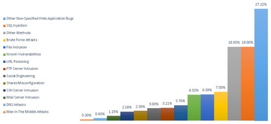 Based on research by Romagna and van den Hout [1], the most common type of attacks used to exploit web page vulnerability are web application bugs (27.22%) followed by SQL injections (18.00%). Other techniques used are man-in-the-middle (MitM) attacks (0.3%), DNS attacks (0.6%), mail server intrusion (1.15%), SSH server intrusion (2.18%), share misconfiguration (2.38%), social engineering (3%), FTP server intrusion (3.11%), URL poisoning (3.76%), and other known vulnerabilities (6.32%). File inclusion vulnerabilities are used to deface websites in around 6% of cases. To access the web server, brute force attacks are used in 7% of cases and other methods are used in 18% of cases [1]; see Figure 5.