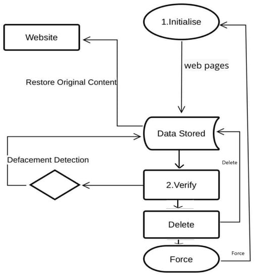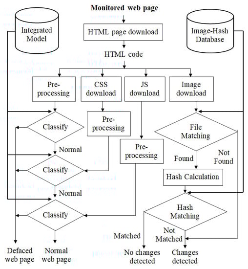 Defacement detection techniques may be categorized into three categories: anomaly-based detection, signature-based detection, and machine-learning techniques. Anomaly-based traditional techniques involve checksum comparison, DIFF comparison tools, and signature-based detection; however, the simplest and fastest technique is checksum comparison. The checksum comparison uses a hash algorithm, such as MD5 or SHA1, and starts with a profile, by calculating the hash value for the web page in normal conditions, and then stores it in a database to compare later with another hash value for the same web page. Comparisons such as this compare the current website’s hash value with the original value already stored in a database. If it has the same value, the web page is clear and no modification has been done, and its integrity has been checked. If the content hash value changes and does not match the original hash value, there is an attack and modification on the web page. It works well for static web pages.