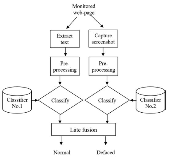Nguyen et al. [26] proposed detecting website defacement attacks using web page text and image features. They proposed a combination model for website defacement detection using text and image features used with deep-learning techniques, and they contributed by detecting the defacement, measuring the accuracy to a high level (97.49%), and reducing false alarms to 1.49%. The method is a combination model of website defacement detection consisting of two stages, the training, and the detection stage. The training stage is all about training the data sets, which are either normal or defaced web pages. A total of 57,134 HTML files and 57,134 screenshot image files were collected from normal working web pages. A total of 39,100 HTML files and 39,100 screenshot image files were collected from defaced web pages. Both text and image features are extracted to be trained to the model by extracting the pure text and capturing the screen. The next step will be training, by pre-processing the text with the BiLSTM algorithm and pre-processing the image with the EfficientNet algorithm. The detection stage shown in Figure 8 starts by monitoring the web page’s HTML code and then extracting features by pre-processing and classifying them into two classifiers. The No. 1 text classifier and No. 2 image classifier will be combined using the late fusion method to obtain the results, which is a either normal or a defaced web page. The model based on deep-learning techniques and the BiLSTM and EfficientNet algorithms has achieved high detection accuracy and reduced the false alarms better than the previous works [22,23] discussed earlier. In Nguyen et al.’s study of detecting website defacement attacks using web page text and image features, combining the text and image features leads to great detection results [22,23]. It has one shortcoming, in that it has more computational resources as well as highlighted above. What can be seen in the results accuracy is that the defacement detection model based on combining machine-learning techniques and attack signatures [23] is the best among the other works thanks to the accuracy rate of 99.26% and false positive(FP) rate of about 0.27%. Hoang et al. have succeeded in their results that depend on strong techniques. Figure 7 and Figure 8 illustrate the detection stages of the algorithms writers have used to describe and implement the method of their proposals. In general, they combined it with other algorithms and used different ways to train the data into the models to classify it. Considering the web page HTML code file, CSS code file, Java Script code file, and even the embedded image file, all these factors must be involved in the machine-learning defacement detection-based method.