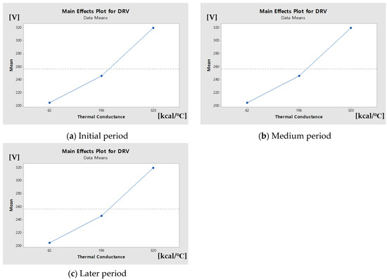 The temperature-dependent change is significant compared to the previous study. The results according to the thermal conductivity of the splitter plate performed in the past are as follows [14]. The thermal conductivity of copper, aluminum, and steel are 320, 196, and 62, respectively, where the DRV result of the initial period is 196, 155, and 97. The rise rates of aluminum and copper compared to steel are 59.8% and 102.1%, respectively. One can also check the thermal conductivity and the trend of the results. This study is characterized by a large nonlinearity. For this reason, mainly experimental studies were conducted. From this point of view, the linearity of the results with temperature is of great significance.