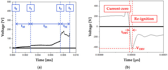 In order to analyze the short-circuit characteristics and the dielectric recovery voltage, important measuring points in the waveform are shown in Figure 4. Figure 4a shows each point for the operation of the circuit breaker when an over-current inflows. t0 is the time that the overcurrent flows into the breaker, and t1 is the time when the electrodes begin to separate. t2 is the time when the arc formed after electrode separation reaches the splitter plate, and t3 is the timing of the current reaching zero after the arc is extinguished on the splitter plate. Therefore, t10 represents the time until the moving electrode is separated from the fixed electrode after the inflow of overcurrent, and t21 represents the time the arc moves to the splitter plate after the contact is disconnected. t31 represents the time at which the arc reaching the splitter plate is extinguished. Figure 4b shows each point of the dielectric recovery characteristics of the circuit breaker after the current reaches zero. When a recovery voltage exceeding the dielectric strength is applied between the fixed electrode and the moving electrode after the current reaches zero, the arc is re-formed and the voltage is discharged. The voltage at this time is VDRV, and the time taken from the current zero to the re-ignition is tDRV.