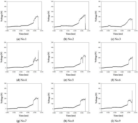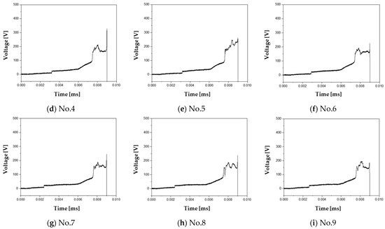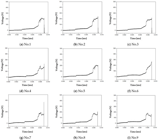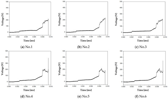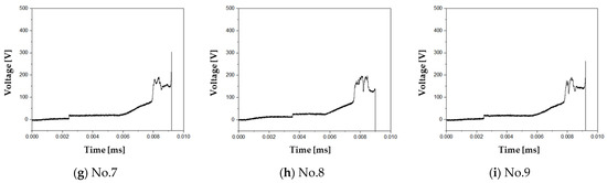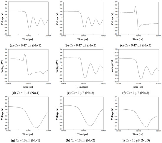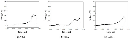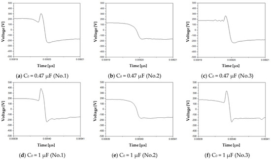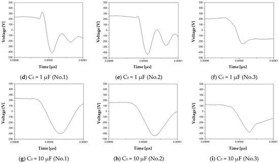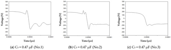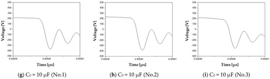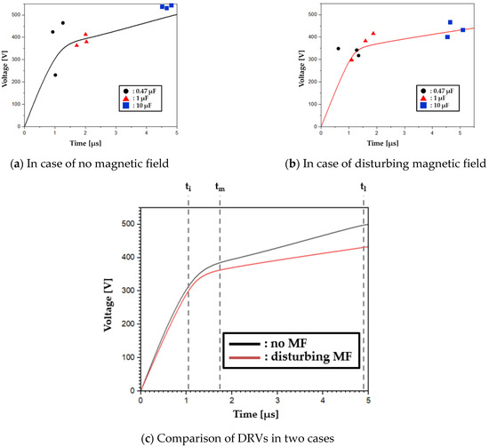 Table 5 shows the values of dielectric recovery voltage (DRV) under disturbing magnetic fields. Each C0 value (0.47, 1, and 10 μF) shows the average voltage and average time. Using these voltages and times, Figure 17 shows the DRV V-t curve under distanced magnetic fields.
