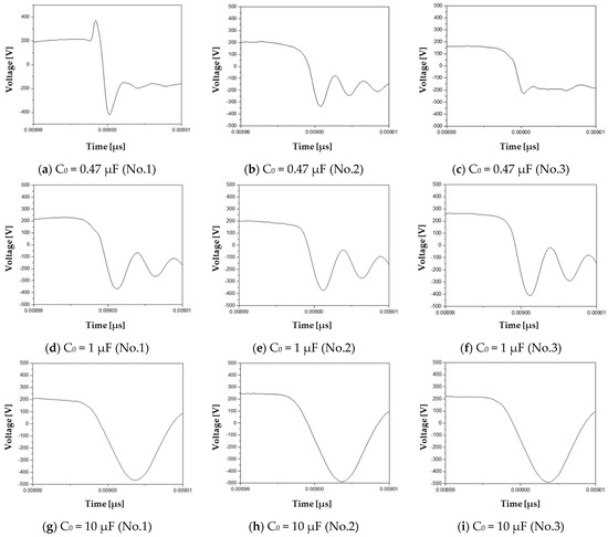 The results are as follows. The average time corresponding to each of the C0 values (0.47 μF, 1 μF, 10 μF) is 1.08 μs, 1.75 μs, and 4.73 μs, respectively. At ti, with and without disturbed magnetic fields, the DRVs are 320 V and 305 V, respectively. At tm, with and without disturbed magnetic fields, the DRVs are 382 V and 361 V, respectively. At tl, with and without disturbing magnetic fields, the DRVs are 491 V and 429 V, respectively.