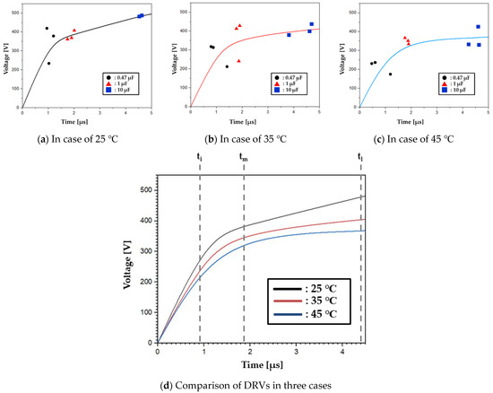 Table 3 shows the DRV at 25 °C, 35 °C, and 45 °C It shows the C0 values (0.47, 1, and 10 μF) and their corresponding average voltage and average time, respectively. Using these voltages and times, Figure 13 illustrates the DRV V-t curve according to the temperature.