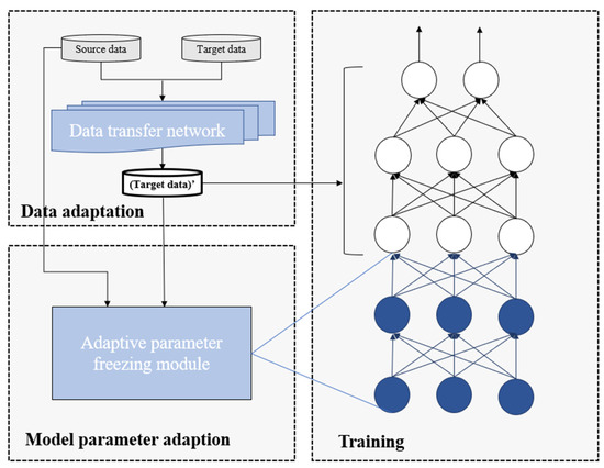 The overall flow diagram of the proposed method is shown in Figure 1. The DA-Transfer incorporates a data adaptation module and a model transfer adaptation module to improve the classification performance of small-sample traffic. The implementation process of the method consists of three parts: data adaptation, model parameter adaptation, and transfer network training. Firstly, the target dataset is fed into the data adaptation module to reduce the distribution distance from the source dataset to be close to the original attributes of the trained large network. Secondly, the mapped target dataset is input into the model parameter adaptation module together with the source dataset to obtain the recommended freezable network parameters. Finally, the transfer network parameters are adjusted according to the recommended information, and the mapped target dataset is fed into the pre-trained network for fine-tuning to finally realize a small-sample traffic classification model adapted to the target dataset.