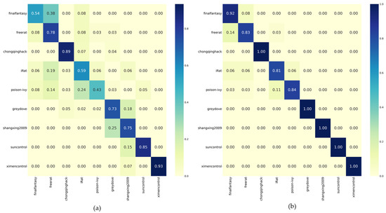 We use the training data of the target dataset to train two traffic classification models, namely the direct training model and the DA-Transfer model, and use the test data to test the two models. Figure 4 shows the normalized confusion matrix for the classification results of the test datasets obtained by the two models.