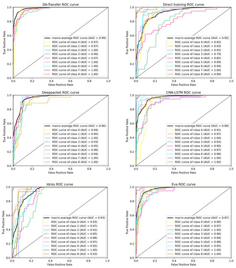 Figure 6 shows the ROC curves and AUC values of the six methods on each type of data in the test set. The x axis of the ROC curve represents the false positive rate (FPR) and the y axis represents the true positive rate (TPR). The curves closer to the upper left corner of the graph represent the superior performance of the classifier. It is obvious from the graph that the ROC curve of each type of DA-Transfer method is closer to the upper left corner. The AUC value of the average ROC curve represents the average accuracy of the model for nine classifications of datasets. The AUC values of the six methods are DA-Transfer (0.99), direct training (0.92), Deeppacket (0.96), CNN-LSTM (0.96), Idriss (0.93), and Eva (0.97). The results show that the DA-Transfer method is superior to other methods.