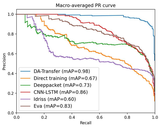 When the positive and negative distributions of the test samples are uneven, PR can more effectively reflect the quality of the classifier than ROC. In order to comprehensively evaluate the model, we evaluated the PR indicators for the six models. We calculate the average precision (macro-Prediction) and average recall (macro-Recall). We draw the macro-Average PR curve and calculate the mean average precision (mAP), as shown in Figure 7. When the accuracy and recall rate are high, the model performance is better, so the curve is expected to be close to the upper right corner. Figure 7 shows that the PR curve for the DA-Transfer method is closer to the upper right corner and the mAP is higher. Therefore, the average classification performance of the DA-Transfer model for the nine test set classifications is better than the other methods.