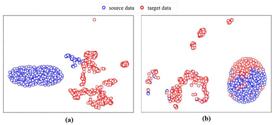 Figure 9a shows the original distribution distances of the source and target datasets, where the red circles represent the data distribution of the target dataset and the blue circles represent that of the target data, from which it can be seen that the data distribution of the target dataset is scattered and differs greatly from that of the source dataset.