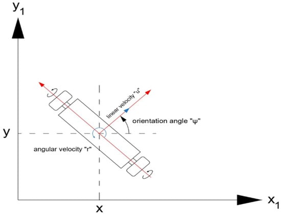 The wheels of the TWR are driven by two high-torque DC motors; both motors have a difference in rotational speed, which enables the TWR to move with a linear velocity ‘u’ and an angular velocity ‘r’. Velocity ‘u’ is along the y-axis, while velocity ‘v’ is along the x-axis. The differential equations, which describe the position coordinates and orientation angle, are represented by Equations (2)–(4).