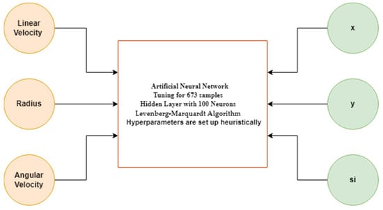 The nonlinear kinematics, Equations (2)–(4), of a TWR, were modeled in Simulink, and a dataset of 673 samples was acquired. This whole dataset is made up of samples taken under 12 different conditions with varying values of the linear velocity of the DC motor and radius. The sampling period was 0.25 s. Each dataset has different values of radius ‘r’ and linear velocity, thus having different output values. This radius ‘’ converts the rotation of the high-torque DC motor into linear velocity ‘’ along ‘x’ and ‘y’ directions according to a well-known formula given by Equation (5).