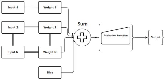 In the input data, weights are assigned to each input to convert those inputs into hidden layers. Weights are multiplied with the input data, and their sum is provided to neurons present in the hidden layers. The neuron is then fed with a bias value. All the values are summed up and then transited through an activation function. The activation function decides whether a specific neuron becomes activated or not. If a neuron is activated, its information is transferred to other layers until it reaches the output layer. Overall, this whole work is summed up [26] in Figure 3.