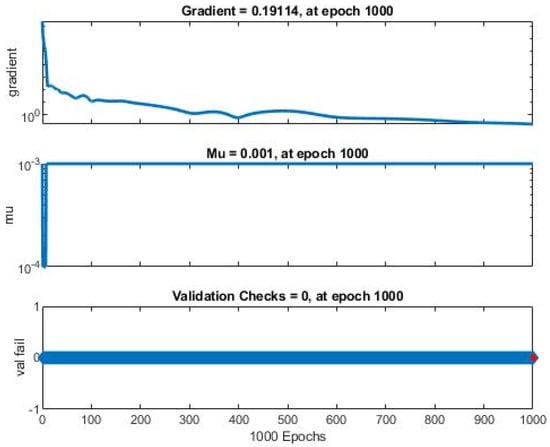 In ANN training, inputs and outputs were fed separately after acquiring the data in the workspace. The neurons in the input and output layers are three, as for this system, there are three inputs and three outputs. The number of hidden neurons was heuristically selected as 100 to reach the desired goal of minimum MSE and maximum regression value. The network chosen was a feedforward network. The training algorithm chosen for this system was ‘Levenberg–Marquardt’ because it takes less time but more memory. In total, 470 samples were taken for training purposes, while 101 samples were taken for validation and testing. The performance of the training state is shown in Figure 4. It shows the response of the gradient curve, the Mu parameter (i.e., the control parameter for the algorithm), and how it directly affects the error convergence value. The gradient value is 0.19114 at an epoch of 1000, the value of the control parameter is 0.001 at an epoch of 1000, and validation fails are 0 at an epoch of 1000. The training was terminated at the 1000th epoch due to the maximum number of epochs being reached, i.e., a hyperparameter that was set in tuning, as shown in Figure 4.