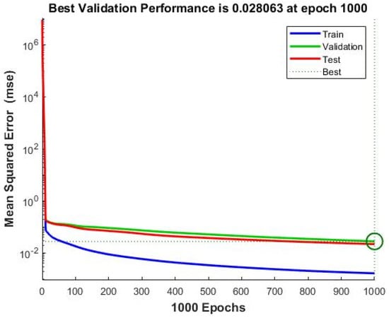 According to the results given in Table 1, in all three phases, the minimum value of mean square error goes to . The regression values extracted for this trained ANN show that the model is close to the ideal one, as its value is 0.99999. A plot of MSE is shown in Figure 5, which shows the best validation performance of an MSE of 0.028063 that was achieved at epoch 1000. This figure depicts how the MSE value varies.