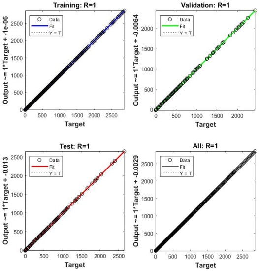 If we talk about the regression values, ideally, the value is ‘1’, which is shown in the plots of regression given in Figure 7. The circles show the samples, and if the circles are on the center-fit line, it means that targeted values and outputs match. The closer a sample is to the fit line, the higher the regression value will be for that particular phase. All the responses of regression give the value of ‘1’, and the case is similar for the overall regression analysis response for the combined phases.