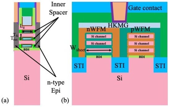 - Mertens, H.; Ritzenthaler, R.; Chasin, A.; Schram, T.; Kunnen, E.; Hikavyy, A.; Ragnarsson, L.-Å.; Dekkers, H.; Hopf, T.; Wostyn, K.; et al. Vertically stacked gate-all-around Si nanowire CMOS transistors with dual work function metal gates. In Proceedings of the 2016 IEEE International Electron Devices Meeting (IEDM), San Francisco, CA, USA, 3–7 December 2016; pp. 19.7.1–19.7.4. [Google Scholar] [CrossRef]