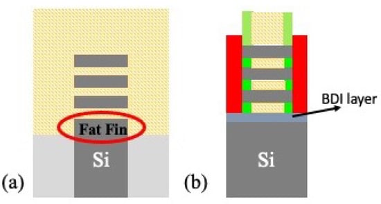 In this section, we highlight the comparison between a full bottom dielectric isolation (BDI) and punch through stopper (PTS) scheme as examined by [24]. To introduce the problem, we first introduce the "fat-fin" effect that is unique to GAA nanosheets, where process non-idealities can result in a structure that causes an increased capacitance in the bulk region below the nanosheets, as shown in Figure 3. Although this structure is unique to GAA nanosheets, the effect, also known as sub-fin leakage, exists for FinFETs and is dealt with using the punch through stopper scheme. So, a comparison between this established PTS scheme and novel BDI scheme is performed on the basis of off-state leakage current, short channel effects, and effective capacitance (); it is shown that BDI could potentially provide improved and power-performance co-optimization.