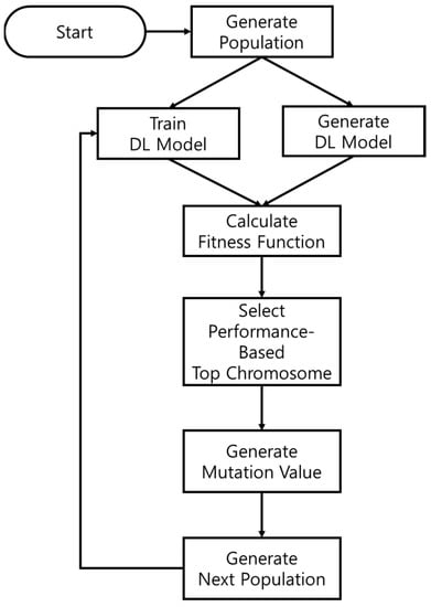 To quickly find the optimal global solution for the genetic algorithm, the number of Epochs was designated as five. After learning five times, a test dataset was utilized to compare the mean squared error (MSE) performance; therefore, the best chromosome could be selected. A new generation was created by selecting an upper chromosome and hybridizing the two upper chromosomes at an arbitrary ratio. After generating a new generation by selecting a higher chromosome, a mutation value was added to at least one randomly designated chromosome. The range of mutant chromosome values for applying mutant chromosomes to new generations is shown as follows in Table 3.