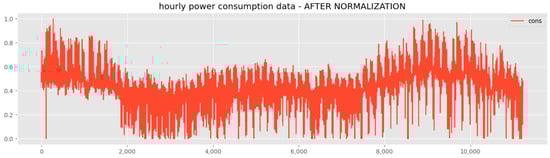 Figure 4 shows the normalized data. In order to utilize actual power data, outliers were not removed or used. In order to use the power consumption data for deep learning, the window size was designated and configured; therefore, the power consumption could be predicted by viewing the window size. To this end, the window size was designated as 20. For the generalization of the general deep learning model, the dataset was classified as 80% training data and 20% testing data. The dataset configuration was approximately as shown in Table 4. The power consumption data consisted of a minimum of 0 kWh to a maximum of 297.49 kWh. This introduced a problem in which a long time was required during the optimization process when learning with the deep learning model, or there may have been bias toward changes in some values. To prevent this, the data were normalized to the training dataset and applied to the testing dataset.