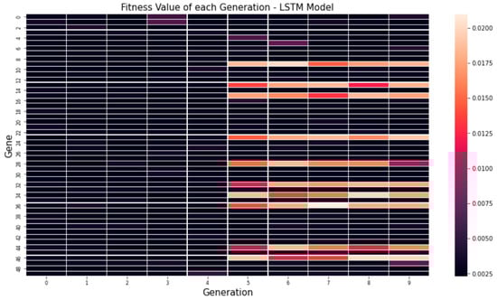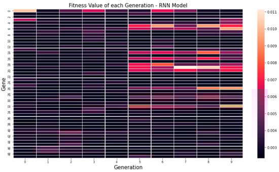 Figure 5 shows the average MSE values for each generation through a genetic algorithm. In the figure, it can be seen that the minimum value, maximum value and average value are low on average. Figure 6 and Figure 7 visualize the fitness value derived when 10 genes are applied over 50 generations to optimize hyper-parameters by applying our proposed algorithm to the RNN and LSTM models. Looking at the fitness value for each gene, it can be seen that the newly derived genes can be used to find the global optimal solution as well as the continuous optimization as the generations progress.