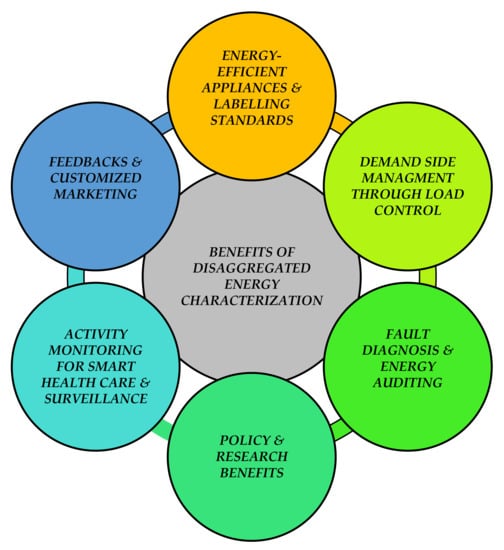In the digital age, modern cities have transformed into smart cities. In such cities, big data collected by sensors require sophisticated algorithms for their analysis and security for multidisciplinary applications [1,2]. Due to digitization, the power grid system has evolved into a smart grid. A smart grid offers better options for renewable energy penetration, but the intermittency of renewable generation poses price volatility and grid stability problems [3,4]. In the smart grid, utilities tend to have more installations of smart meters in their advanced metering infrastructure (AMI). Aggregate demand data collected by smart meters assist in understanding consumer behaviors in aggregation, demand forecasts, customer segmentation, etc.; however, improved demand-side management, better policy designs, and sustainable development require disaggregated energy characterization at the appliance level [5,6]. Disaggregated energy characterization can foster economic gains and technical benefits for diverse stakeholders through innovative services [7,8,9]. It also assists in efficient resource usage, conservation of energy and the environment, and improved living in smart sustainable cities [10]. Some of the benefits of this characterization are shown in Figure 1. A detailed review of such benefits in the context of the United Nations’ Sustainable Development Goals of 2030 and deep decarbonization goals of 2050 is presented in [6].