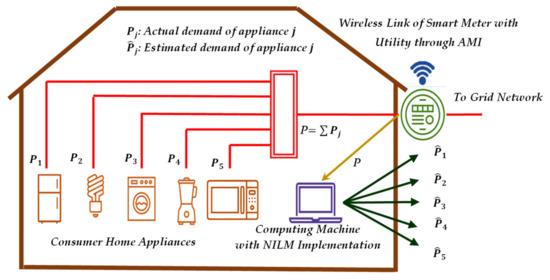 To extract appliance-level energy characterization, intrusive and non-intrusive energy disaggregation techniques are used. The former techniques require dedicated sensors for individual appliances, whereas the latter rely on mathematical programming, artificial intelligence, and statistical approaches after getting aggregate demand data from a single sensor. Due to the involvement of a single sensor, which is usually the smart meter, non-intrusive load monitoring (NILM) approaches are more economical for energy disaggregation [11]. The general concept of NILM is depicted in Figure 2 where household-level aggregate demand measured by the smart meter is disaggregated into appliance level demands (ALDs) through the NILM algorithm implemented on a laptop computer. As smart meters are increasingly being installed for utilities, it seems a better choice to implement NILM solutions on the smart meters [12].