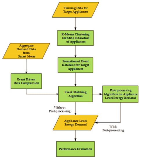 The devised NILM approach is based on EVD containing all the operational appliance groups that can produce an ADE. As the proposed EMEDA relies on the power states of appliances for EVD formation, its performance can be deteriorated due to abnormal power consumption of target appliances. Furthermore, the EMEDA takes low-frequency real power data collected from smart meters; thus, overlapping appliance combinations can result in erroneous results. To avoid these issues, we made two assumptions in this study: (i) All target appliances are healthy. (ii) Simultaneous state transitions do not occur for multiple appliances. This latter assumption is common in most event-based NILM approaches [43]. The methodology of the proposed EMEDA is illustrated using the flowchart shown in Figure 3.