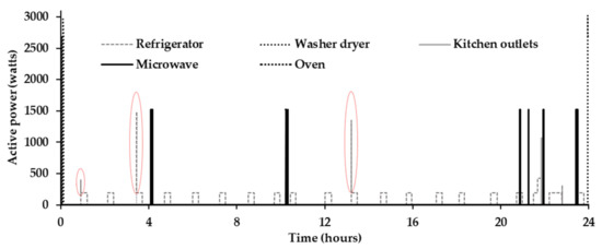 The reduced samples of compressed ADEs were matched in the sorted EVD for their closest record. This closest record represents the estimated ALDs. When matching through the proposed EMEDA, transient events were also detected. The REDD dataset contained low-frequency data sampled after 3 or 4 s; therefore, we selected 6 s as the transient identification period (. ADEs lasting lesser than were detected as transient events. Upon detecting transient events, zero power was assigned to these appliances as their estimated demand. Assignment of zero power is evident in Figure 5 compared with Figure 4, which shows actual ALDs. Assigning zero power to transient events for all appliances suppressed the performance of the proposed NILM algorithm. Results of various evaluation metrics before post-processing are given in Table 4 and Table 5.
