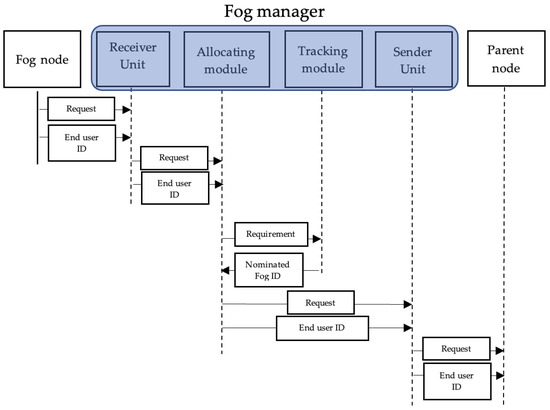 The allocation process illustrated in Figure 3 starts at a requesting fog node. When a fog node receives a request that requires more resources than what is available, it sends the requirements and request to the fog manager. The fog manager receives the request through the receiving unit and sends it to the allocating module. After that, the allocating module sends the requirement to the tracking module to nominate a parent fog node that meets the requirements. The used placement policy is an edge ward one, in which a child–parent attribute is used to determine the parent of the requesting fog node. Once the decision is made, the new fog ID is sent to the allocating module. The allocating module sends the request to the new fog node along with the requesting fog node ID. When the request is processed, the result is sent to back to the managing fog node to be sent to the original requesting fog node.