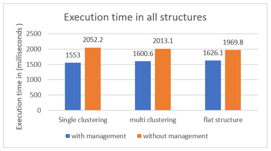 Execution time is the total run time for the fog application, and it is measured in milliseconds. Figure 11 illustrates the execution times of the fog application in different configurations with/without management layer. Since all structures had more than one layer and application modules were interactive, the transmission time between different layers played a major role in delivering the required QoS. Hence, execution time here included processing time (PT), which was CPU time for all fog nodes, transmitting time (TT), which was the time tuples spent on their journey from source to destination, and fog nodes latency (L). First, we calculated CPU time for each fog node, F = {f1, f2, …, fm}, through Equation (1) as follows: