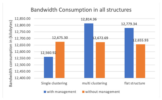 Calculating bandwidth usage is essential to estimate the cost of a system, and it shows the efficiency of resources management and communications between all devices. Figure 12 depicts bandwidth consumption in all 6 configurations. The values on the y axis correspond to consumed bandwidth in kilobytes. Examining the figure, we can see that the proposed model consumed the least amount of network bandwidth, which made this combination of clustering style and a management layer the best configuration of them all in this metric. Structure C, with multi-level clustering and a management layer, recorded the highest bandwidth usage with a percentage of 18% compared to the proposed model. Overall, observing the figure, we can see that including the management layer in multi-layer and flat structures consumed higher bandwidth. This was attributed to how the nodes are connected alongside the management features. Generally, we could say that less bandwidth consumption means less used energy. According to [20], to calculate the energy required to send a bit of data, we need to know the energy spent by the power amplifier, and the electronic circuits, we need to add them up.