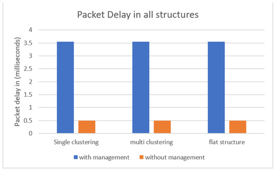 This metric measures the time needed for one data packet to complete a pre-defined packets route. Looking at Figure 13, we can see that structures with a management layer had higher packet delay compared to structures without the management layer. This was assigned to the extra layer added to the structures, which can be referenced as an overhead cost. However, even though packet delay in configurations with a management layer was higher, execution time was still lower, as shown in Figure 11. The packet delay was 3.5 milliseconds, which is not a concerning delay when taking into account other metrics, such as execution time, in Figure 11, and bandwidth consumption, in Figure 12.