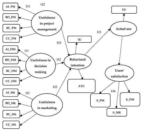 Behavioral intention to use technology as a latent variable has two antecedents, similar to the TAM model [53]: intention to use and attitude towards use (IU and ATU). However, as other researchers [58] proposed, the PMTU model is supplemented with two latent variables: actual use and users’ satisfaction. Actual use has one antecedent—the extent of use (EU). User satisfaction has three antecedents illustrated by using new digital technologies (AI, BD, BC, and CC) in the three areas (PM, Mk, and DMP). To assess the relationships between the two latent variables (actual use and users’ satisfaction following use), two hypotheses must be tested for confirmation: