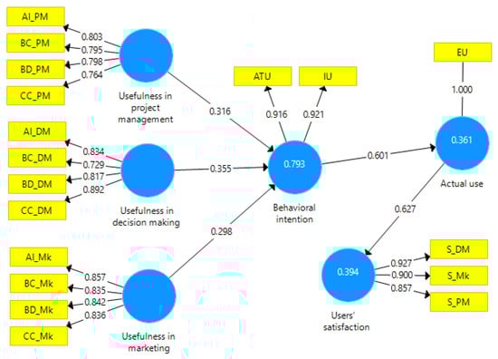 The theoretical model was tested using structural equation modeling in the partial least squares variant. The software for structural equation modeling, SmartPLS v3.0, allows for establishing the relationships among the latent variables. Latent variables have exogenous variables (questionnaire items) as antecedents. For example, usefulness in PM, Mk, and DM are latent variables having as antecedents the utility perceived by users for each of the four technologies (AI, BD, BC, and CC). Other latent variables are behavioral intention (with the intent to use and attitude towards use as antecedents), actual use (with the extent of use as the antecedent), and users’ satisfaction (with the satisfaction of using new digital technologies in PM, Mk, and DM). The first criterion of the model reliability is the loading for each antecedent, which must be greater than 0.7 [63,64]. As seen in Figure 3, all the antecedents of the latent variables have a loading above 0.7.