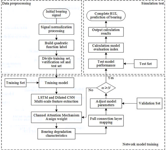 The rest of the paper is organized as follows: in Section 2, the network structure of the bearing RUL prediction method is constructed, and a flow chart of the bearing RUL prediction method is given. In Section 3, the experimental data are firstly pre-processed, followed by the construction of quadratic labels, and finally, the experimental results of the proposed method and the comparison tests are given. Section 4 concludes the whole paper.
