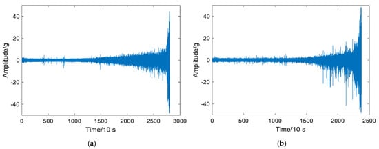 The time domain signals of bearing 1–1 and 1–3 are shown in Figure 7a,b. From Figure 7, it can be seen that the amplitude of the bearing vibration signal changes significantly with time, and the signal shows a tendency to disperse, which is beneficial to the extraction of health feature information with degradation trend.