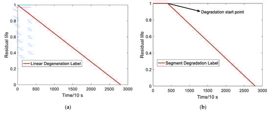 After obtaining the raw vibration data of the bearings, they need to be divided into the training set, test set, and validation set. However, since the raw data do not have corresponding labels, degradation labels corresponding to the vibration data need to be constructed. At present, the commonly used degradation labels mainly include linear degradation labels and segmental degradation labels, as shown in Figure 8a,b below, respectively. The linear degradation label does not need to identify the degradation start point, and it is considered that the normal phase data also need to be predicted, which will greatly improve the training time and is not conducive to network training; the segmental degradation label is trained only for the degradation phase, which reduces the prediction time consumption and also improves the prediction accuracy, but it needs to identify the degradation phase start point, which increases the labor cost.