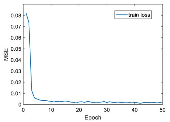 The hyperparameters of the network play an important role in the training of the whole network, so a reasonable selection of the hyperparameters of the network can improve the overall RUL prediction effect. First, the number of batches is set to 64 according to the device configuration. Second, to verify whether the network has reached the convergence state, the loss function curve is visualized in this paper, and the network model training loss is shown in Figure 10. Figure 10 shows that the value of the loss function dropped to below 0.005 after the network reached 10 iterations; thus, it can be concluded that the training has reached the convergence state, so the number of iterations set to 50 is reasonable.