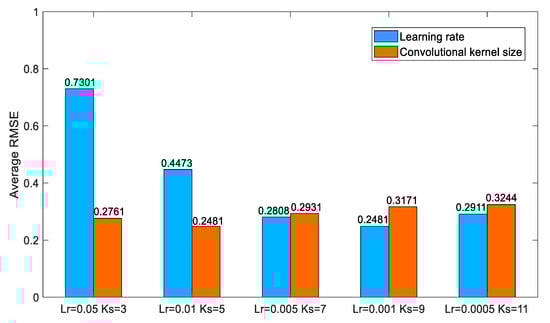 The main parameters that have an impact on the prediction performance of the network model are the convolutional kernel size and the learning rate. Among them, the convolutional kernel realizes the extraction of bearing degradation features, and too large a convolutional kernel size leads to the loss of local information, while too small a convolutional kernel cannot capture the global features. Therefore, in this paper, the convolutional kernel sizes of 3, 5, 7, 9, and 11 are selected as alternatives in turn, and the other parameters are kept unchanged to perform parameter optimization. Similarly, the learning rate is the most important parameter in the optimizer; too small a learning rate will greatly increase the training time, while too large a learning rate will cause the training process to fluctuate greatly, which is not conducive to model convergence. Therefore, the learning rates of 0.01, 0.05, 0.001, 0.005, and 0.0005 are selected as alternatives in the article, and the remaining parameters are kept constant to perform parameter optimization. The evaluation metric is chosen as the average of RMSE of the five test bearings. Figure 11 shows the learning rate and convolutional kernel size optimization search process. In Figure 11, “Lr” denotes the learning rate and “Ks” denotes the convolutional kernel size. The average RMSE is the smallest when the convolutional kernel size is 5, which means that the prediction effect is optimal at this time, so the convolutional kernel size is 5. It can also be observed that the prediction effect is optimal when the network learning rate is 0.001, so the learning rate is 0.001 in this paper.