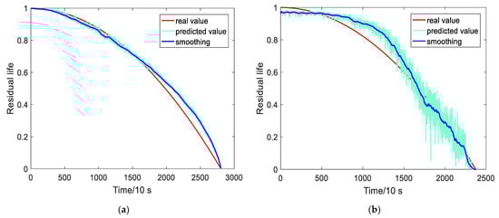 Prediction effect of the method in this paper on bearing 1−1 and 1−3. (a) Prediction effect on bearing 1−1; (b) Prediction effect on bearing 1−3.