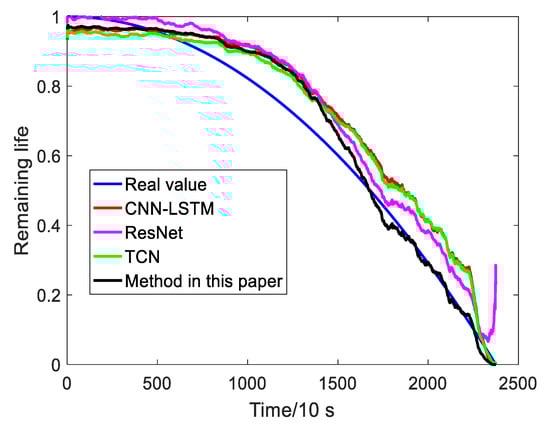To verify the effectiveness and superiority of the proposed method, the residual network (ResNet), CNN-LSTM, and temporal convolutional network (TCN) are selected for comparison tests. Among them, ResNet has residual connectivity, which reduces the risk of overfitting due to the increase in network depth. The CNN-LSTM model can extract both spatial and temporal features and is widely used in RUL prediction. the TCN model has long-term memory capability and achieves better results in time series prediction. The parameters of the comparison methods selected in this paper are consistent with those of the proposed models. The RUL prediction results of each prediction method on test bearing 1−3 are shown in Figure 13, from which it is obvious that the curve of the RUL prediction method in this paper has the best fit with the curve of the real bearing life. This indicates that the overall prediction effect of the proposed method is better than other comparison methods.
